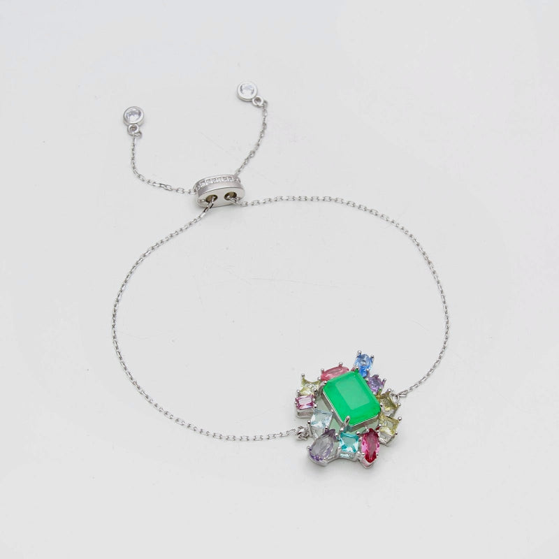 This adjustable bracelet combines the timeless elegance of sterling silver with the vibrant sparkle of emerald and multicoloured crystals. Its flexible design ensures a comfortable fit for any wrist size, while the carefully selected stones add a refined touch of colour, making it a sophisticated accessory suitable for both everyday wear and special occasions.
