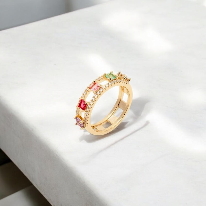 Expertly crafted from colourful zirconia, this ring is a must-have for any jewelry collection. With its striking yet timeless design, it adds a touch of elegance to any outfit. Made with the finest materials, it is the perfect balance of quality and affordability. Elevate your style with this stunning ring.