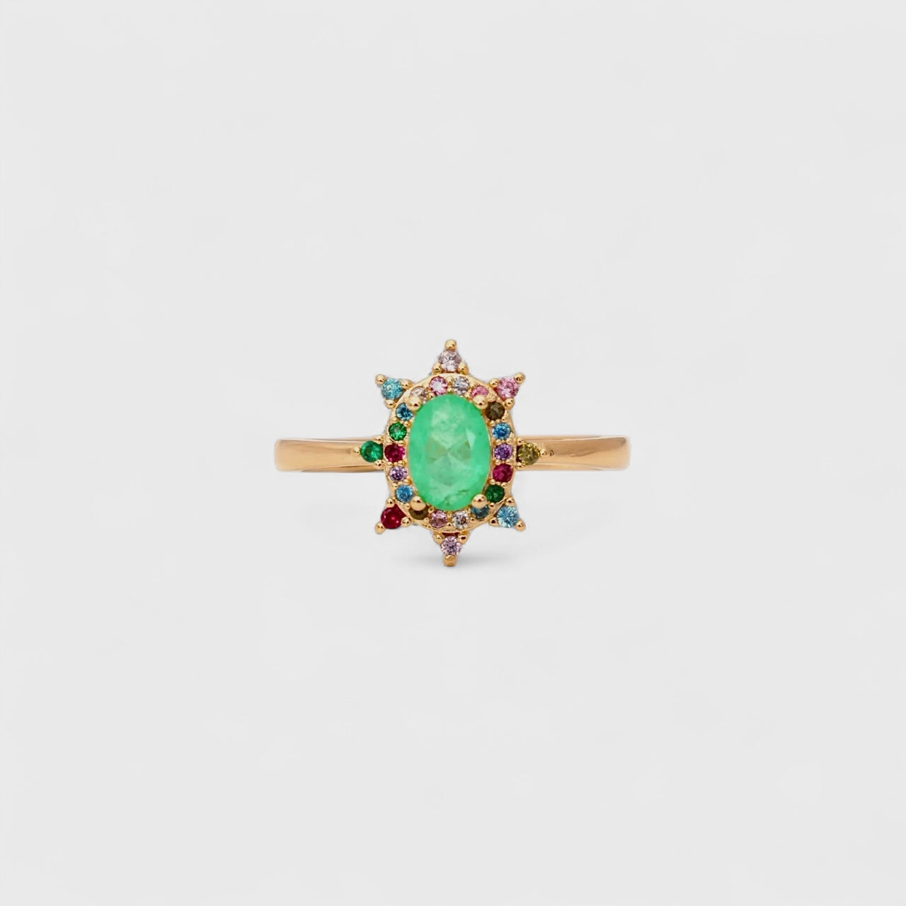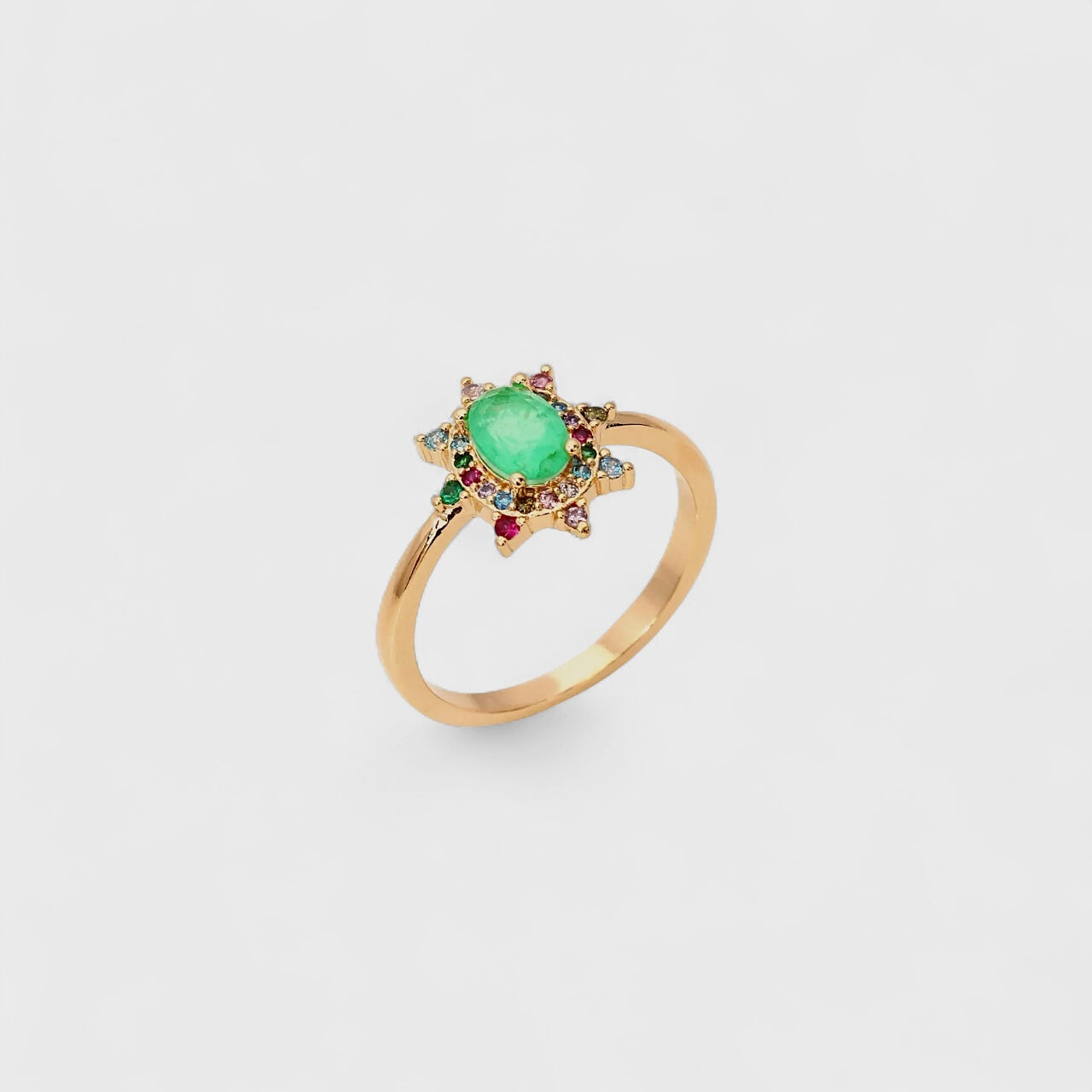 This elegant round zirconia ring showcases a colourful flare, perfect for adding a pop of personality to any outfit. Crafted with expert care and attention to detail, this stylish ring is sure to make a statement. Its versatility allows for effortless pairing with any ensemble, making it a must-have for any fashion-conscious individual.