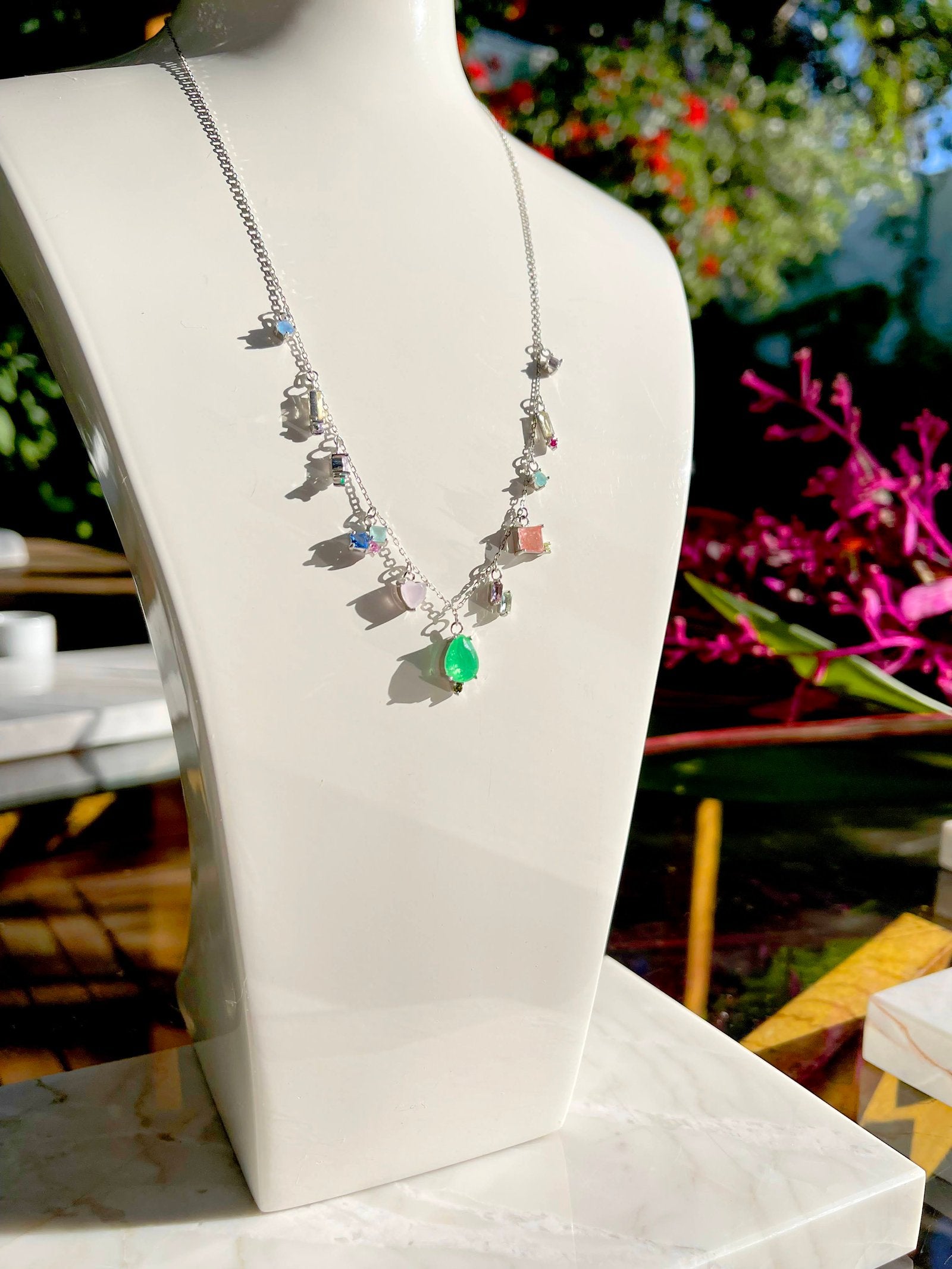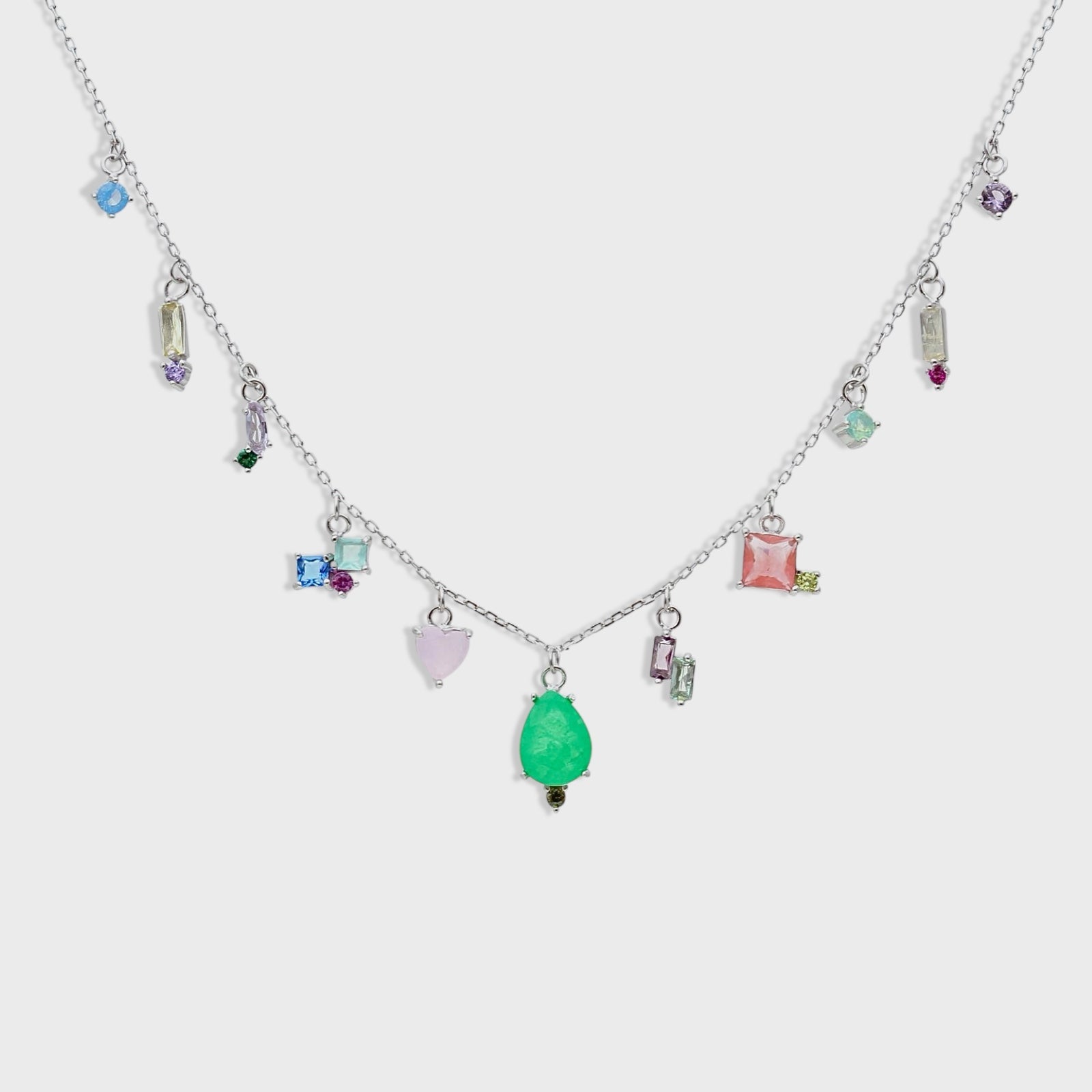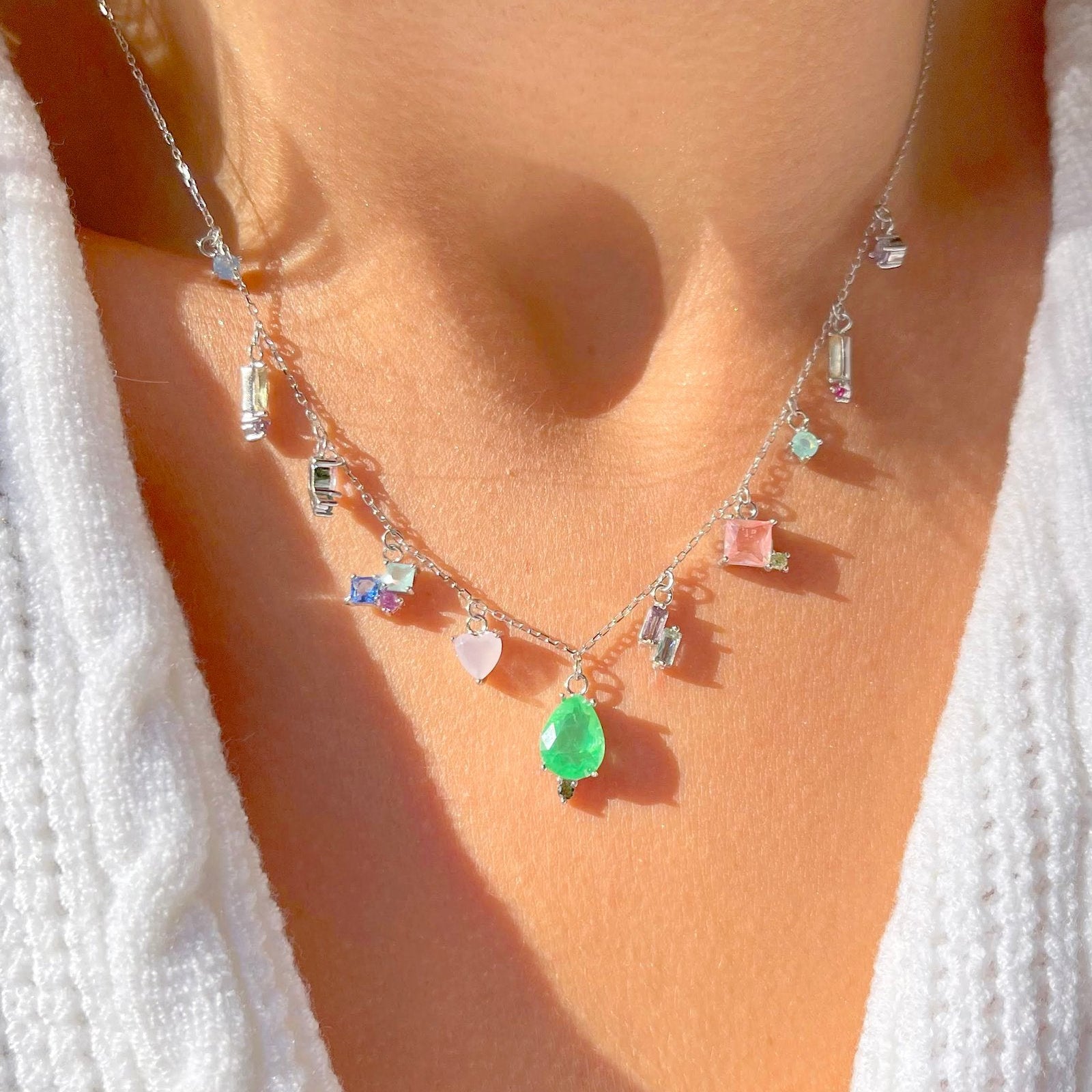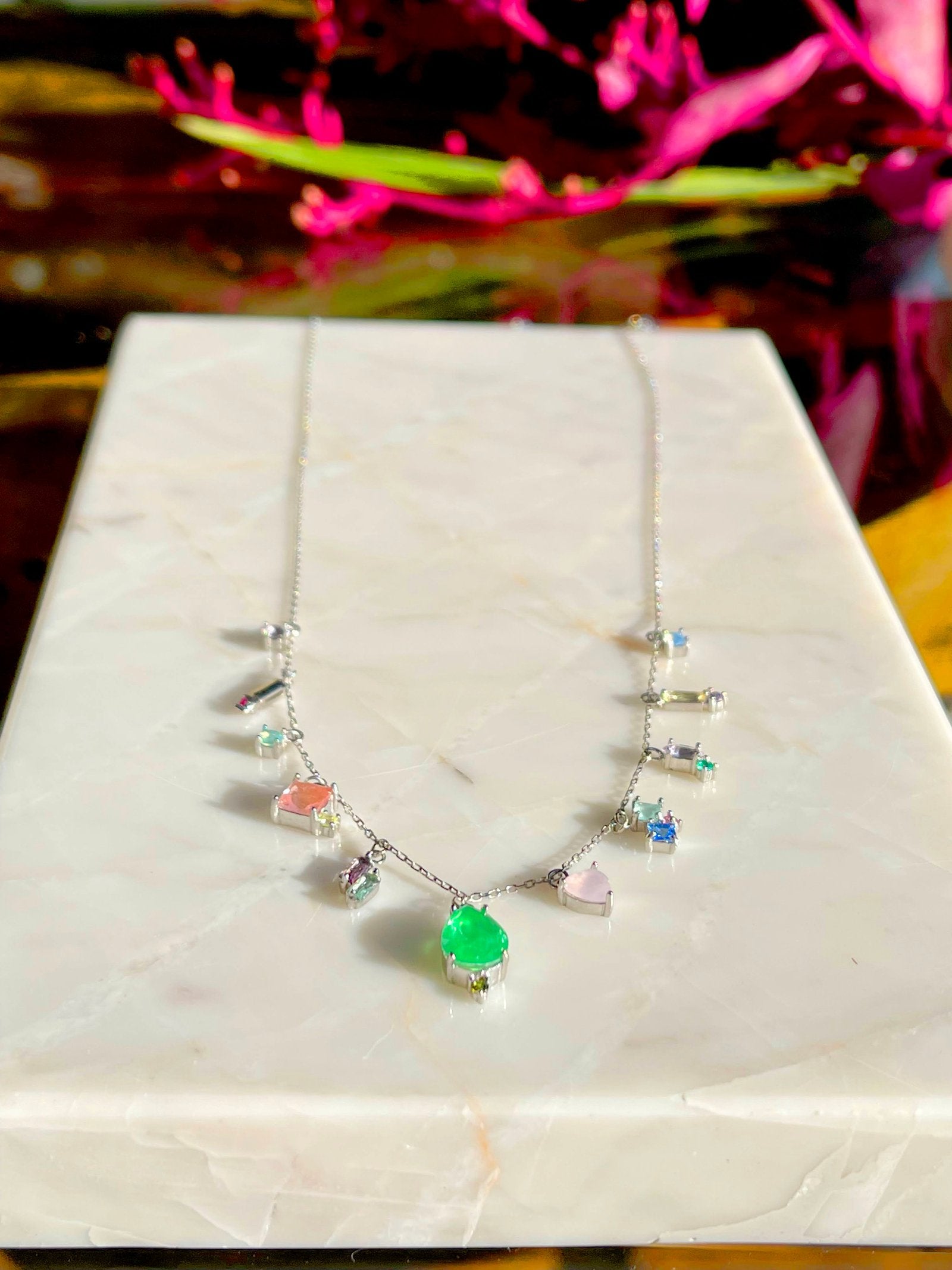 This sterling silver necklace features a delicate dangling design, beautifully highlighted by a fusion emerald centerpiece surrounded by vibrant, colourful crystals. Its expert craftsmanship ensures a refined look that adds both elegance and a subtle splash of colour, perfect for enhancing any sophisticated ensemble.
