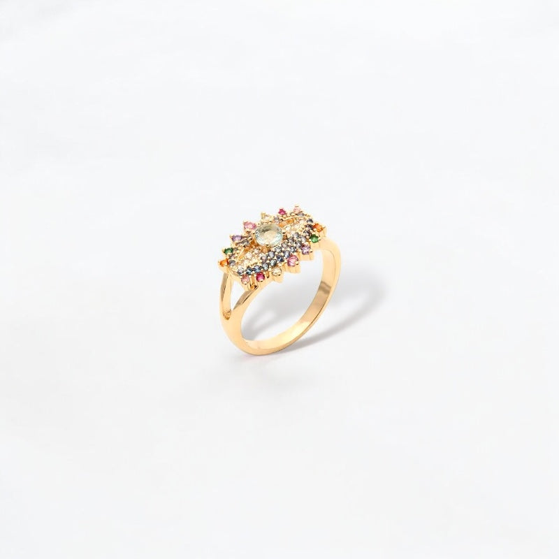 This stunning zirconia ring features a timeless and elegant style. Crafted with vibrant and colourful stones, it adds a touch of glamour to any outfit. The perfect accessory for any occasion, this ring is sure to catch the eye and elevate your look.