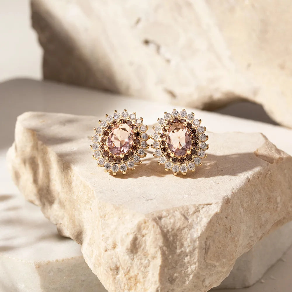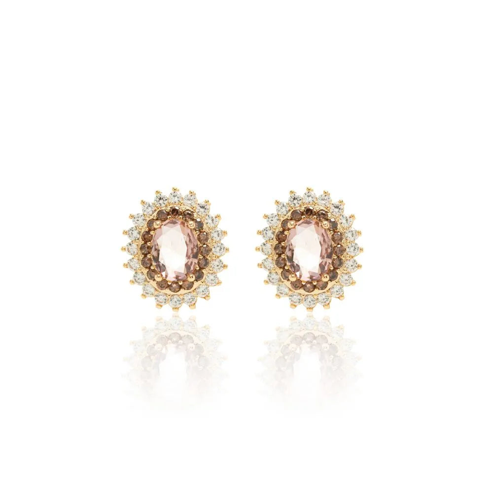 The oval earring with rhodolite crystal and edge studded with white and chocolate zircons is an elegant piece full of shine. With a unique combination of colors, the violet of the rhodolite crystal harmonizes with the white and chocolate zircons, complemented by the gold of the structure.