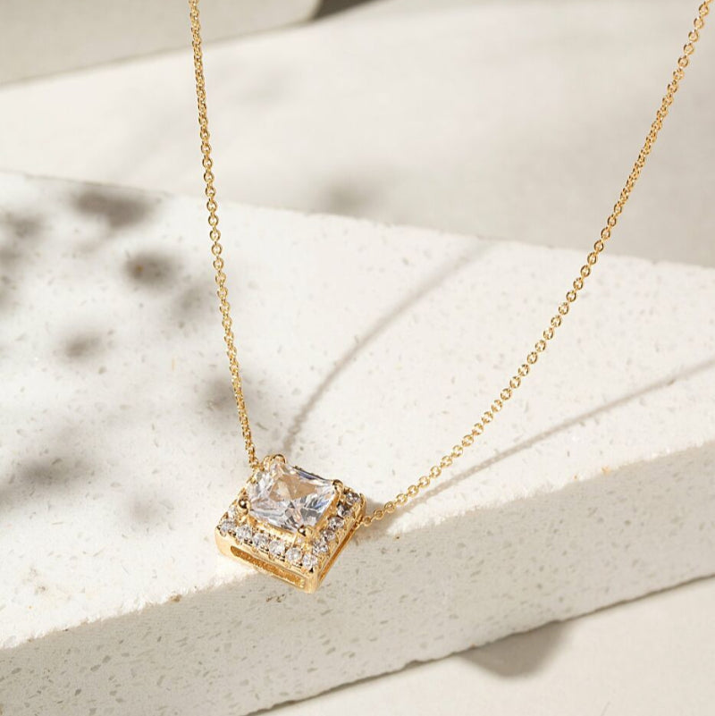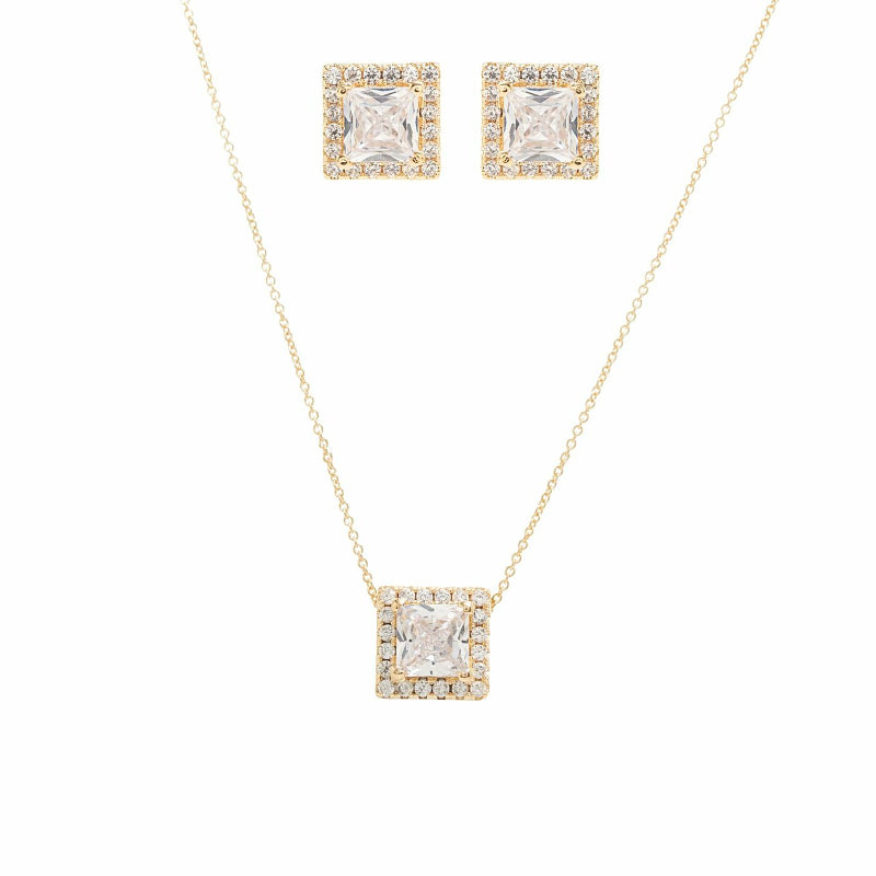 This square zirconia-studded set features expertly crafted pieces plated in luxurious 18k gold, combining elegance with durability. The sparkling zirconia stones are precisely set to maximize brilliance and complement the refined gold finish, making this set a sophisticated choice for both everyday wear and special occasions. Its timeless design balances modern aesthetics with enduring quality.