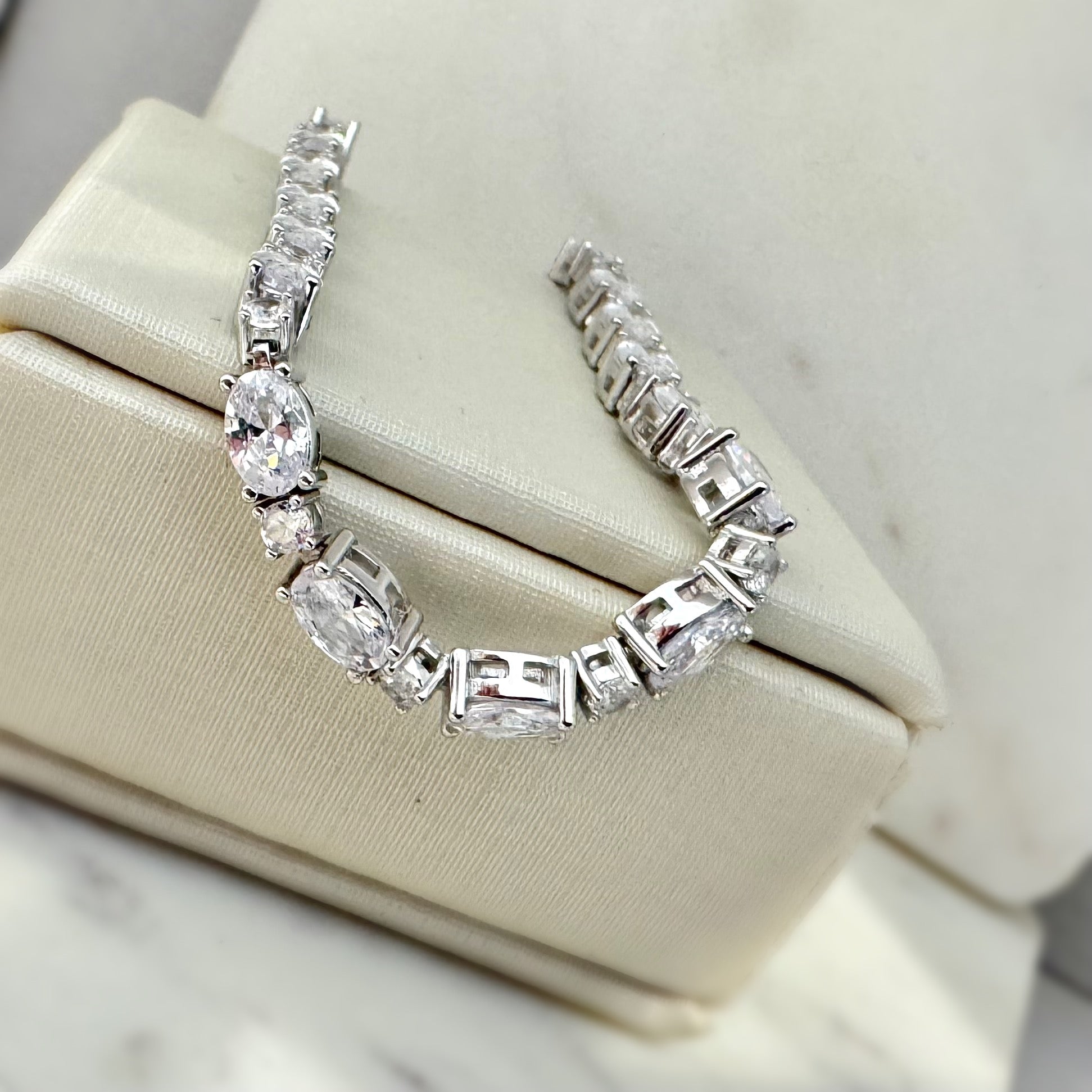 Elevate your jewellery collection with this sterling silver tennis bracelet, featuring meticulously set oval cubic zirconia stones that deliver brilliant sparkle and timeless elegance. The continuous line of precisely cut stones creates a refined, sophisticated look suitable for both everyday wear and special occasions. Crafted from premium sterling silver, this piece combines durability with luxury aesthetics. The classic tennis bracelet design ensures versatility, complementing any outfit whilst maintaining its lustrous finish. An investment in enduring style and quality craftsmanship.